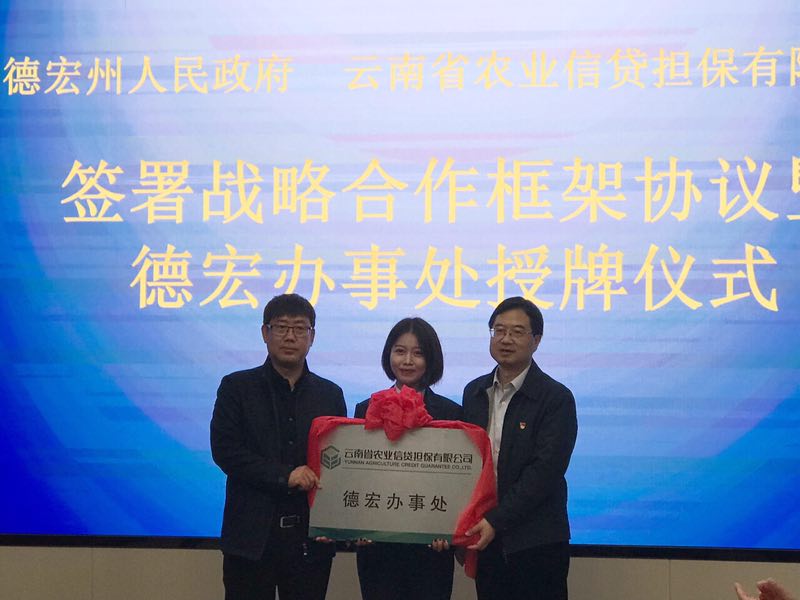 12月19日上午,德宏州人民政府、云南農(nóng)擔(dān)公司簽署戰(zhàn)略合作框架協(xié)議暨德宏辦事處授牌儀式在芒市會(huì)堂舉行。德宏州委常委、常務(wù)副州長(zhǎng)馬云峰,農(nóng)擔(dān)公司董事長(zhǎng)郭影、總經(jīng)理杜開波、機(jī)構(gòu)部負(fù)責(zé)人蔡菲、德宏州財(cái)政局、農(nóng)業(yè)局、人行德宏支行、德宏銀監(jiān)分局、農(nóng)行德宏分行、省聯(lián)社德宏辦、各縣市政府等相關(guān)單位參加會(huì)議。