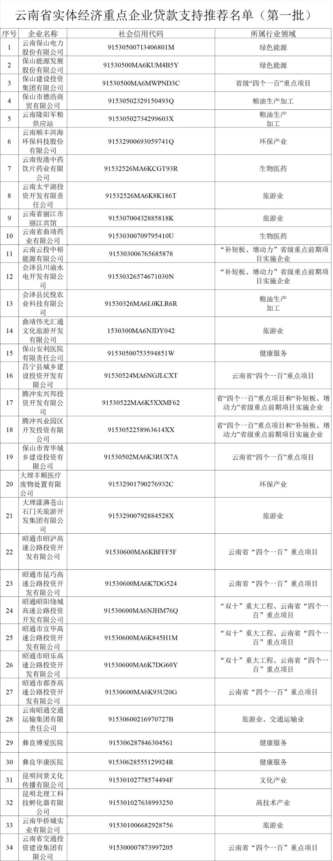 根據(jù)《云南省人民政府印發(fā)關于支持實體經(jīng)濟發(fā)展的若干措施的通知》、《云南省發(fā)展和改革委員會關于貫徹落實支持實體經(jīng)濟發(fā)展的若干措施實行貸款企業(yè)名單制管理有關事項的通知》要求,現(xiàn)將省發(fā)展改革委推送至省工業(yè)和信息化廳、省財政廳、省農(nóng)業(yè)農(nóng)村廳、省商務廳、省文化和旅游廳、省地方金融監(jiān)管局、省稅務局、人民銀行昆明中心支行、云南銀保監(jiān)局、云南證監(jiān)局,以及抄送相關金融機構(gòu)的《云南省實體經(jīng)濟重點企業(yè)貸款支持推薦名單》(第一批)予以公布。